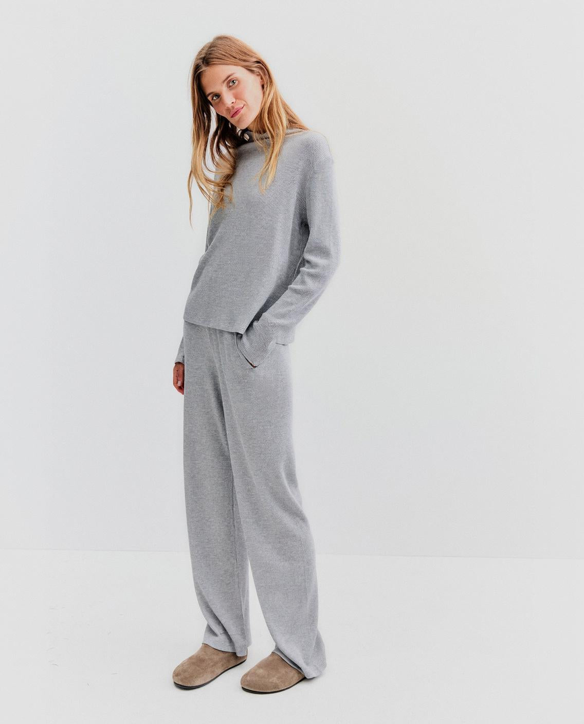 Mmmm. Warm waffles. The Arizona waffle knit top is soft and drapey with a subtly sweet lettuce-edge mockneck. Wear it on its own with denim or pair it with the matching Jan pant for a great alternative to the classic sweat suit.