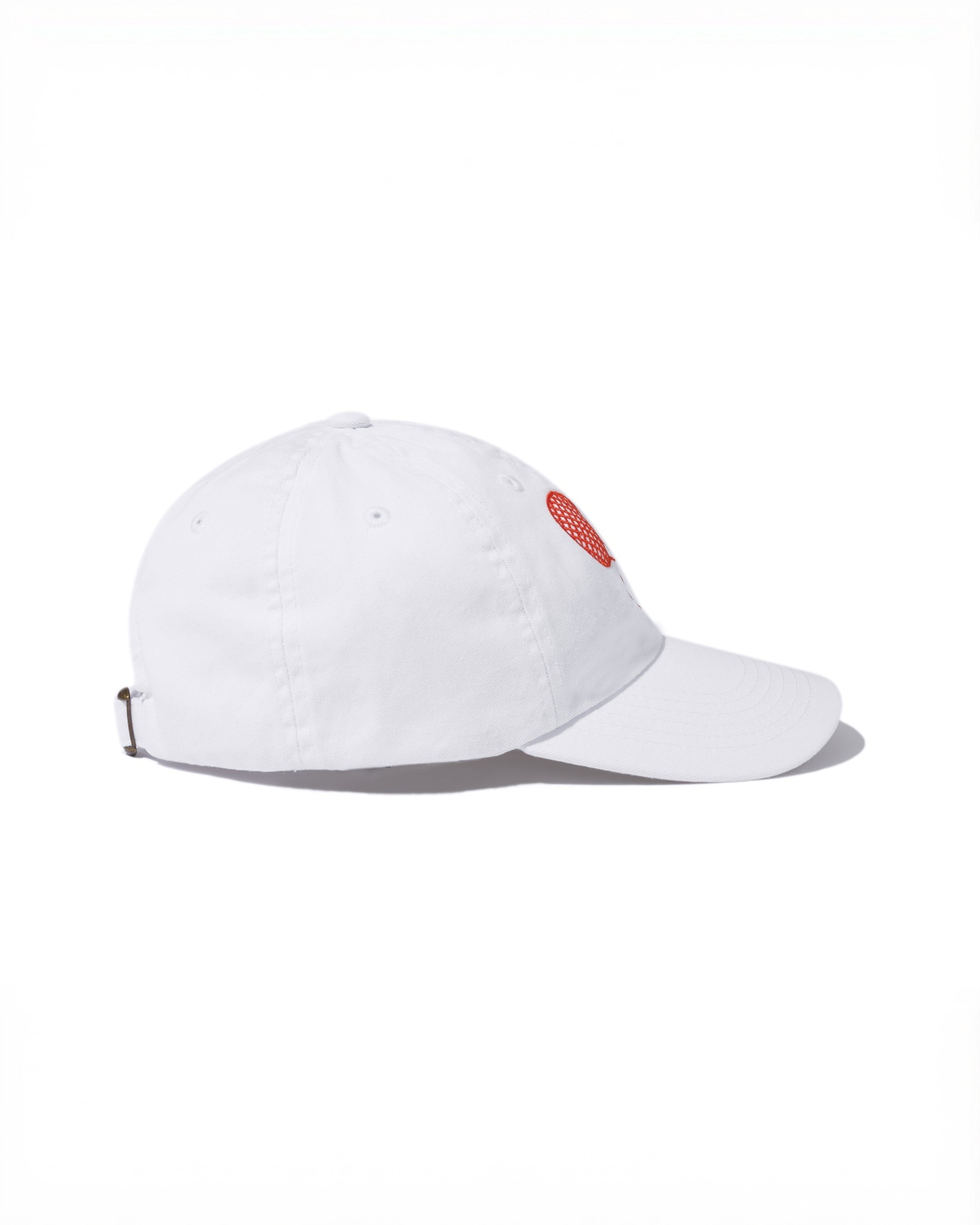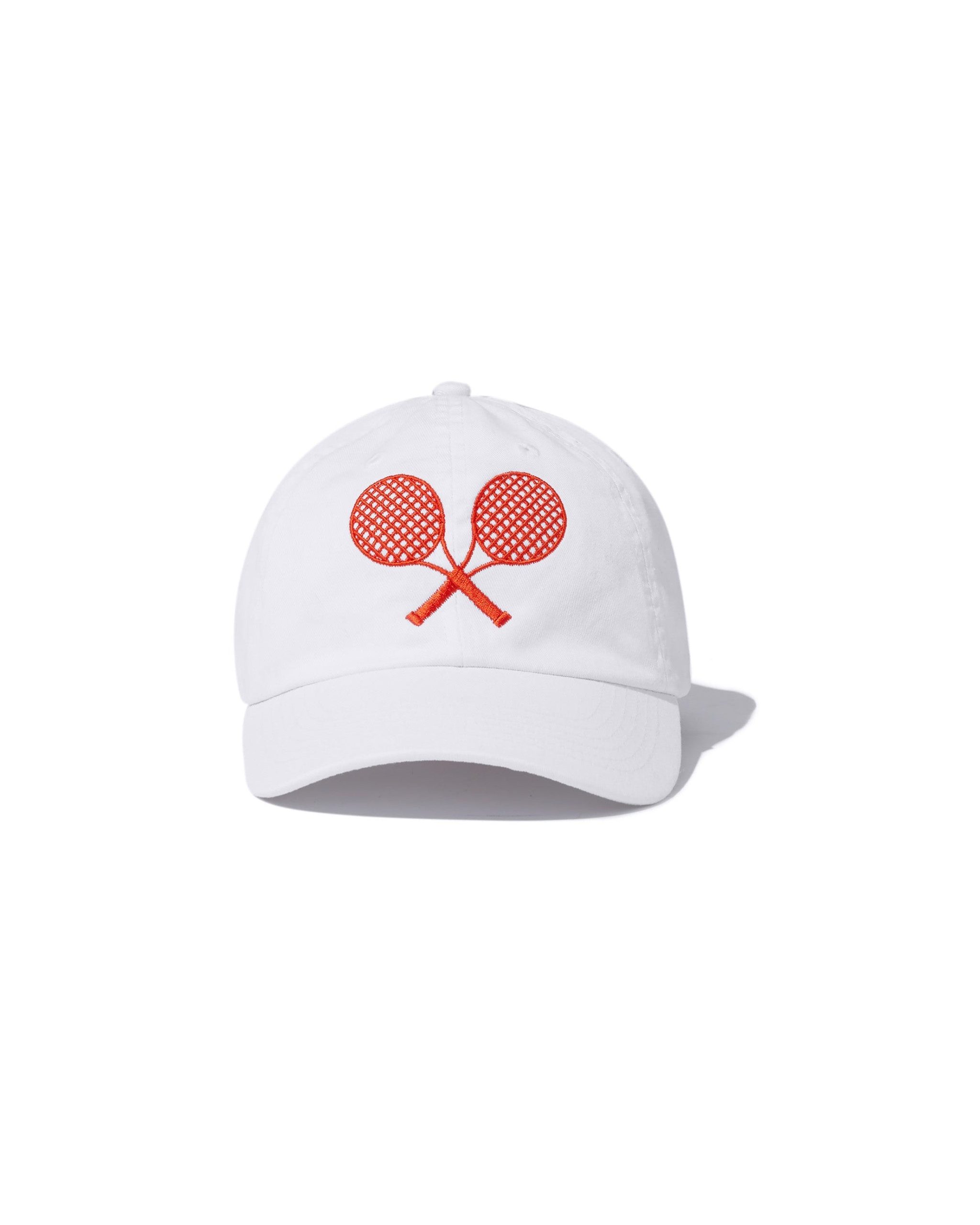 Hit the courts in our racket logo tennis cap in white and poppy.